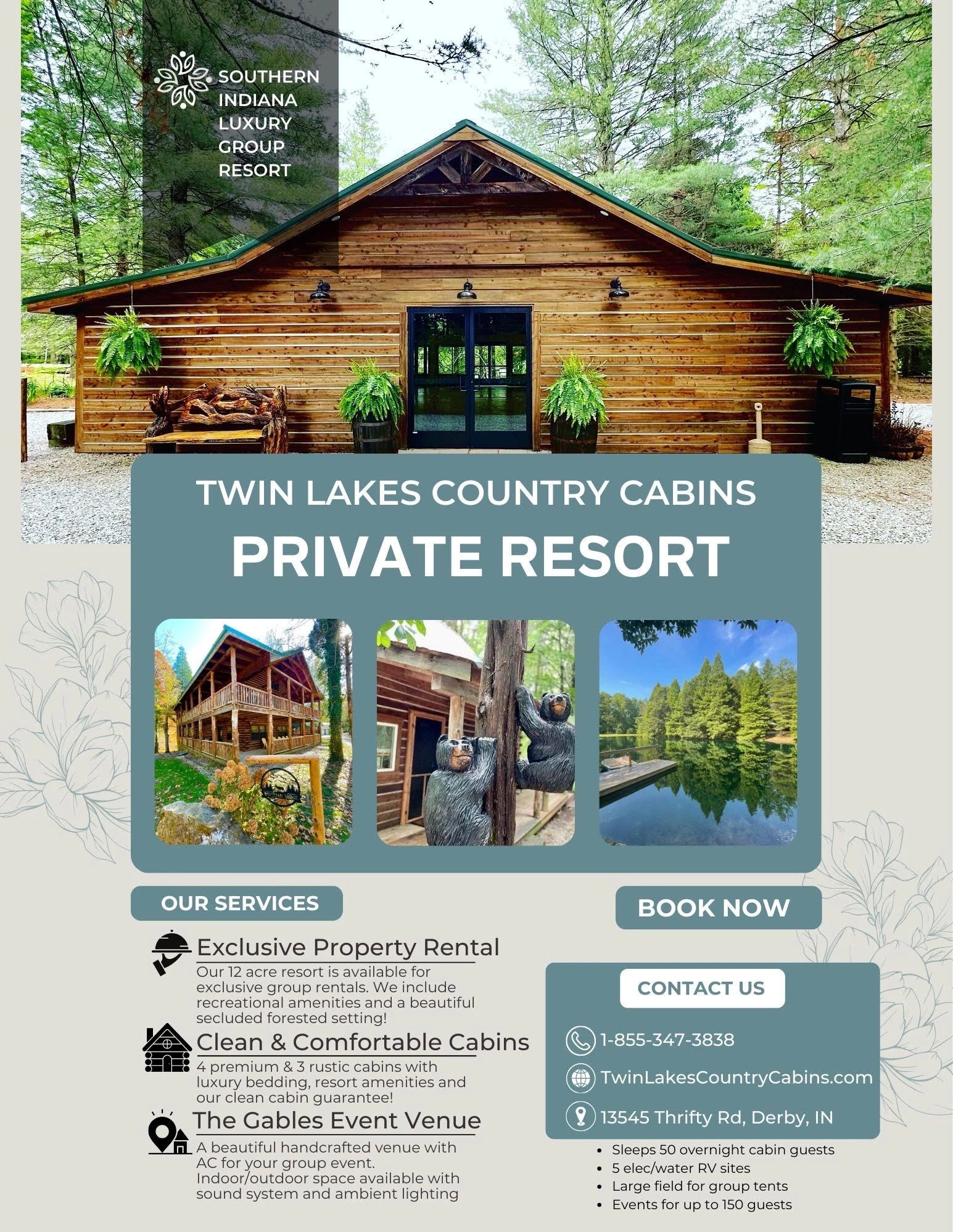 Whether your business, organization or group needs a property with accommodations, an event venue, recreational activities and is nestled amongst nature, we've got you covered! We are Southern Indiana's private resort for hosting your event deep in the evergreens of the Hoosier National Forest! Find peace and solace!
